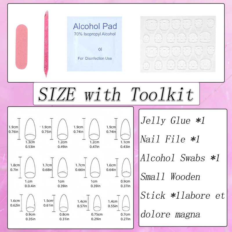 - Package List: 24 pcs short press on nails kit, each box includes 24 fake nails, 1 sheet of 24 adhesive nail tabs, 1 cuticle stick, 1 double sided nail file and gel nail cleaning pads.