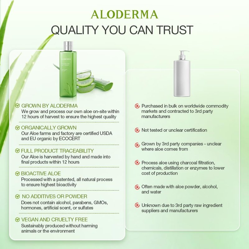 - Made Within 12 Hours of Harvest: At Aloderma, our skincare is rooted in the earth. Our Aloe is processed on-site and turned into final products within hours of leaving the fields to ensure that we capture the natural power of Aloe Vera in every product we make.