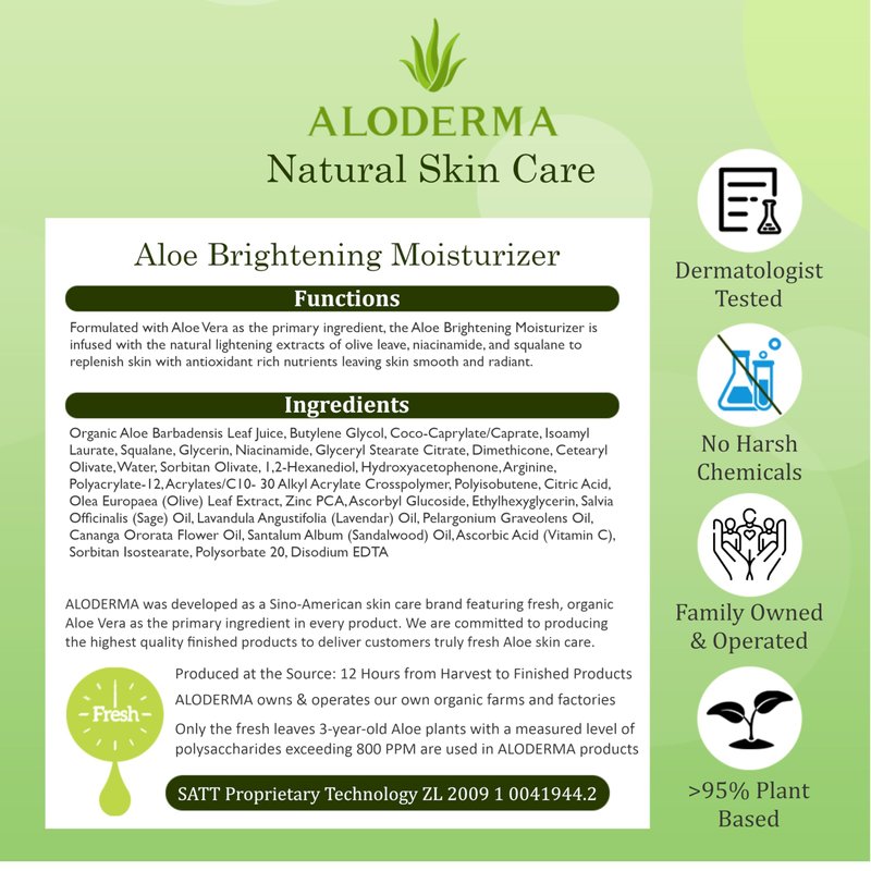 Unveiling a radiant complexion is easier than ever with Aloderma's Aloe Brightening Moisturizer, a face lotion powerhouse formulated with 75% fresh, organic aloe vera. This facial lotion is specifically designed for normal, dry, maturing, and hyperpigmented skin, effectively tackling uneven skin tone, fine lines, wrinkles, and dehydrated skin. Featuring a blend of antioxidant-rich olive leaf extract, brightening niacinamide, and hydrating squalane, this aloe face moisturizer nourishes and protects, leaving your skin smooth and radiant. We use only pure, fresh aloe vera, never any concentrates or fillers, and over 95% of our ingredients are naturally derived. Free of harsh chemicals, artificial fragrances, and cruelty-free, Aloderma infuses the power of nature's goodness into every bottle.