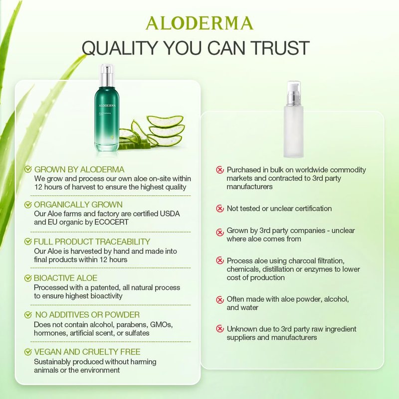 - Aloderma: We are a family run farm-to-face skin care line focused on producing and creating high-quality organic aloe vera-based products in an ecologically friendly way. We grow organic aloe vera on our own farms and manufacture all of our products in our factory, which are certified USDA and European Union organic by ECOCERT. Aloderma has over 20 years of working with Aloe providing high quality and affordable products for beauty, health and wellness.