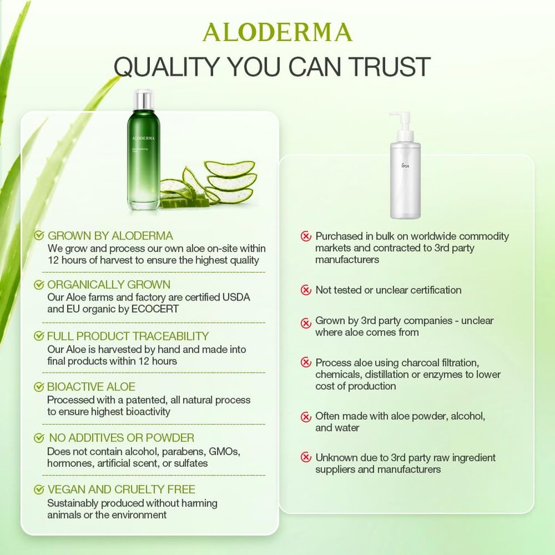 - ALODERMA: We are a family run farm-to-face skin care line focused on producing and creating high-quality organic aloe vera-based products in an ecologically friendly way. We grow organic aloe vera on our own farms and manufacture all of our products in our factory, which are certified USDA and European Union organic by ECOCERT. Aloderma has over 20 years of working with Aloe providing high quality and affordable products for beauty, health and wellness.
