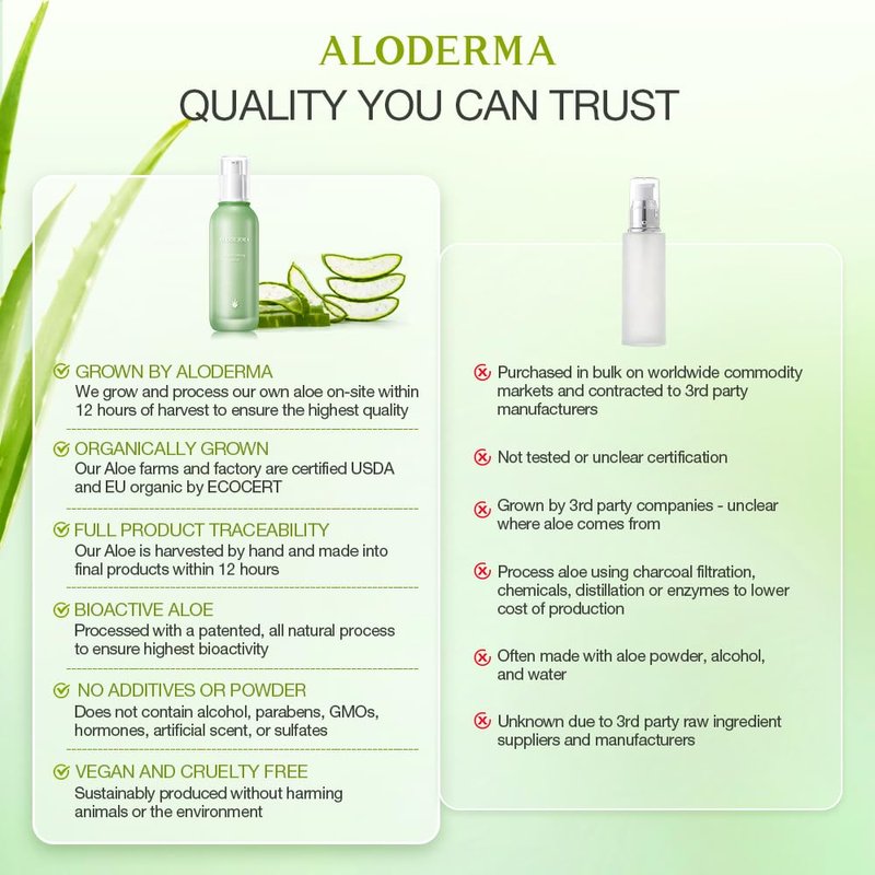 - Made within 12 hours of harvest: At Aloderma, our skincare is rooted in the earth. Our Aloe is processed on-site and turned into final products within hours of leaving the fields to ensure that we capture the natural power of Aloe Vera in every product we make.
