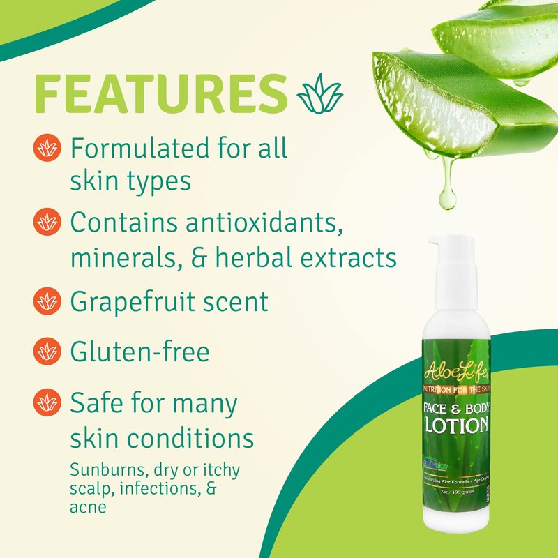 Aloe Life - Face & Body Lotion, Concentrated Formula, Hydrates Dry Skin, Contains Antioxidants, Minerals, & Herbal Extracts, Pleasant Grapefruit Scent, Safe For All Skin Types, Gluten-Free (7 oz)