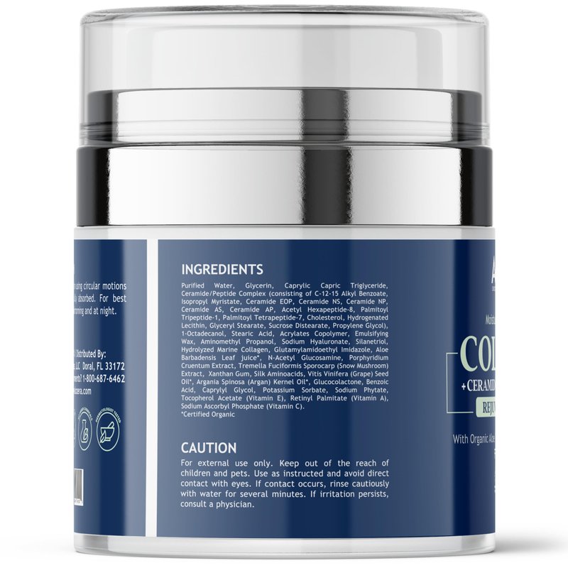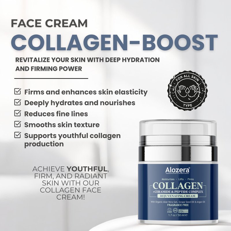 - Collagen Face Moisturizer Cream: Deeply hydrates and nourishes, leaving skin smooth and supple all day. Combats dryness, fine lines, and wrinkles with a potent anti-aging blend of collagen and peptides for improved texture, elasticity, and a firming lift effect.