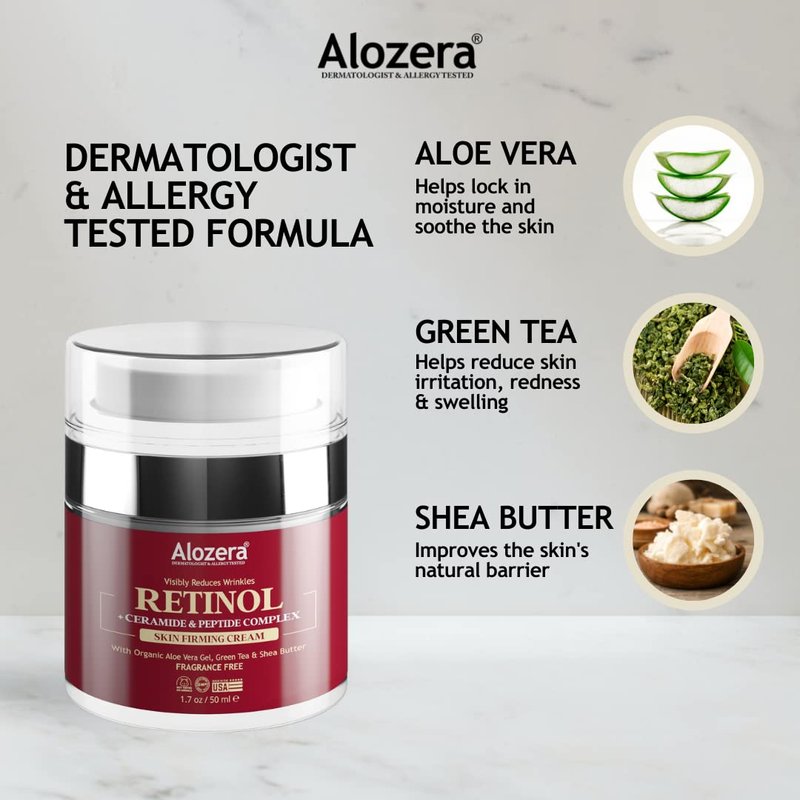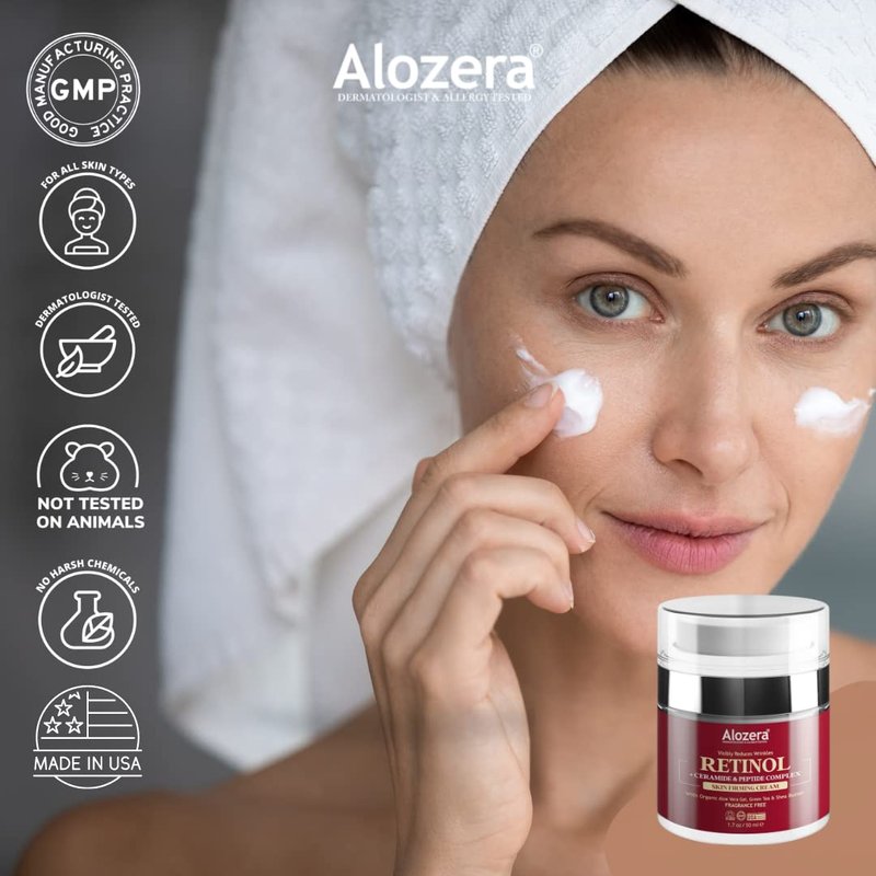 Alozera Retinol Face Cream - Anti Aging, Anti Wrinkles, Reduces Fine Lines & Pores - Retinol (Vitamin A) Moisturizer Enriched with Peptide Complex and Collagen, 1.7 oz