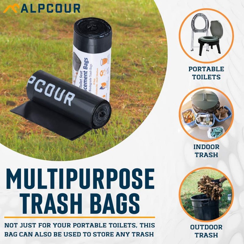 - MULTI-PURPOSE DISPOSABLE BAGS – Although it Focuses on Being a Toilet Replacement Bag for the Alcpour Portable Toilet Seat, It Can Also Act as a Compostable Garbage Bag which is More Eco-Friendly and Can Easily Fit on Your Car's Compartment or Any Storage Area During Long Car Trips, Sudden Beach Nights, and Camping.