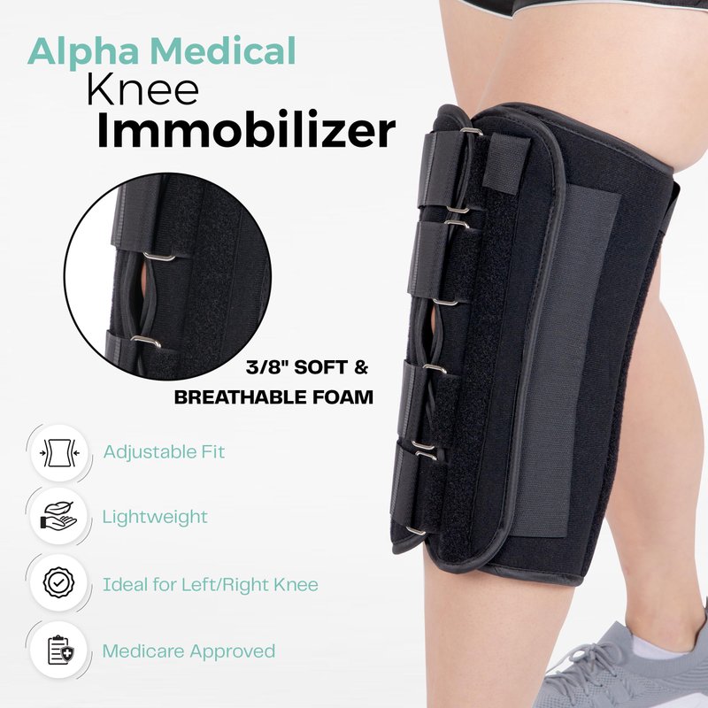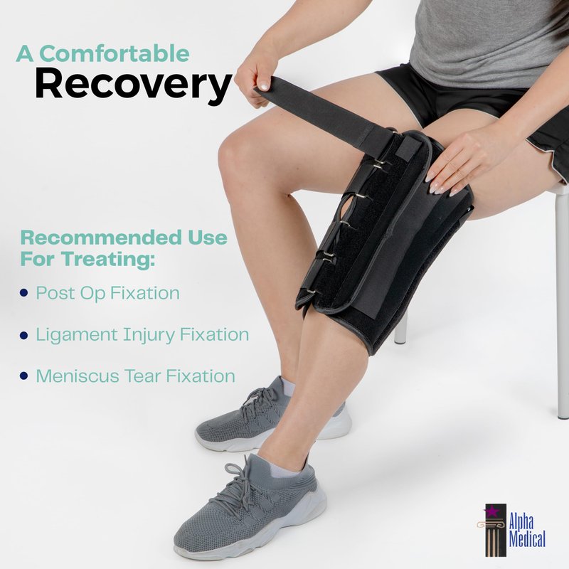 Overall, the Alpha Medical Three Panel Knee Immobilizer is designed for treating knee injuries, particularly those affecting the ligaments or causing severe damage to the soft tissue of the leg. Its focus on comfort, adjustability, and targeted support makes it an effective choice for individuals seeking optimal recovery and relief from knee injuries.