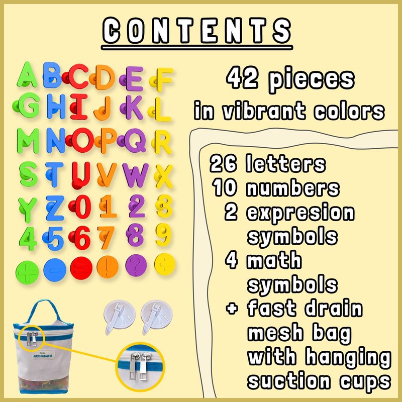 - Introducing Our Vibrant Alphabath Set: Packed with 42 pieces of learning fun! Alphabath includes 26 letters, numbers 1 to 10, and essential symbols (+/x), (-), (=), (!), and (?). Thoughtfully designed with input from parents, teachers, and experts, each piece comes in 6 bright colors, perfect for young learners.