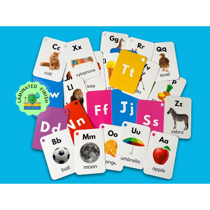 - Designed to withstand many learning sessions, these sturdy cards have a laminated finish that prevents ripping, wrinkling, and smudging. Their 10cm x 7cm size is ideal for little hands to hold and practice with. Give your child a headstart on reading success with these must-have Alphabet Flash Cards!
