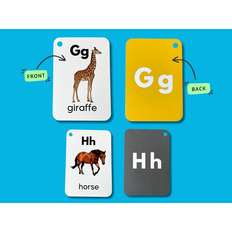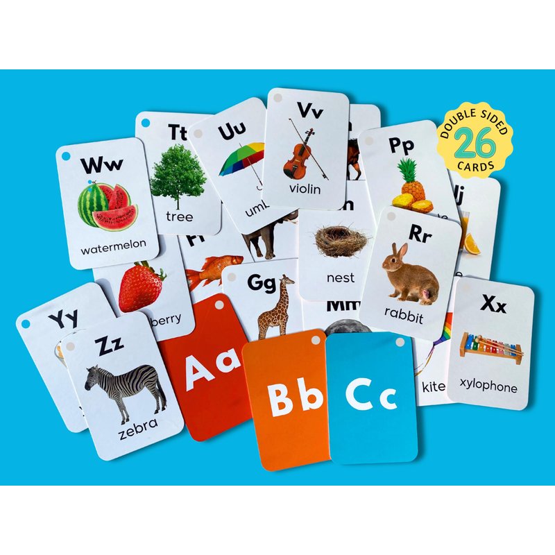 - Teach Your Child the ABCs in a Fun, Interactive Way With These Colorful Alphabet Flash Cards! Double sided cards feature upper and lowercase letters, plus engaging images to help with word association