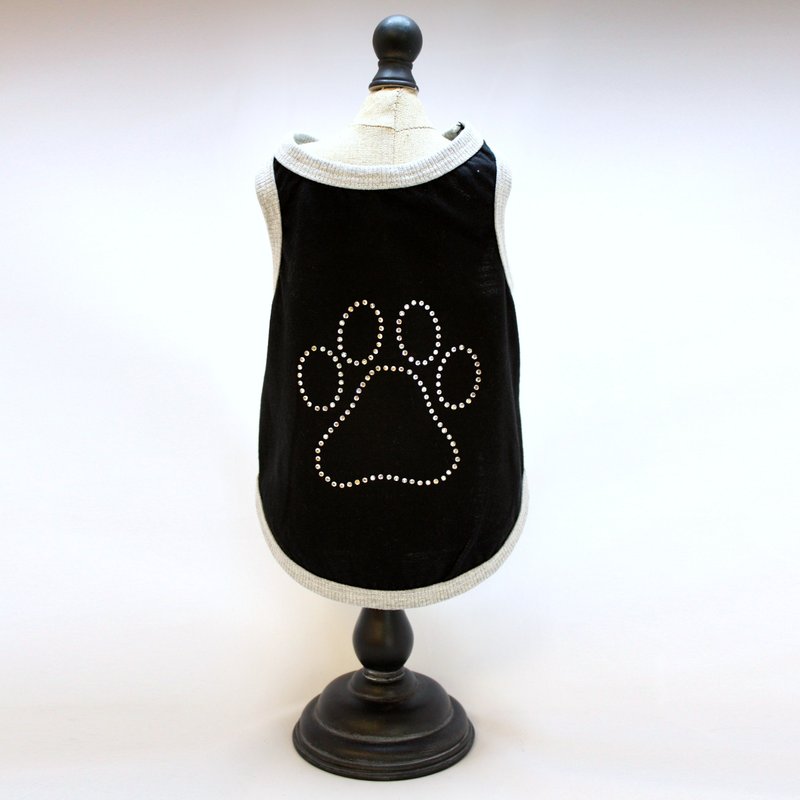 Adorable t-shirt for dogs and cats. These tank tops will bring styles to your pets and smiles to your face. Made with comfortable and stretchy cotton/polyester fabric and features rib binding on sleeves and bottom.Your pet will be looking good to everyone with the original and beautiful paw rhinestone attached. All made in USA.