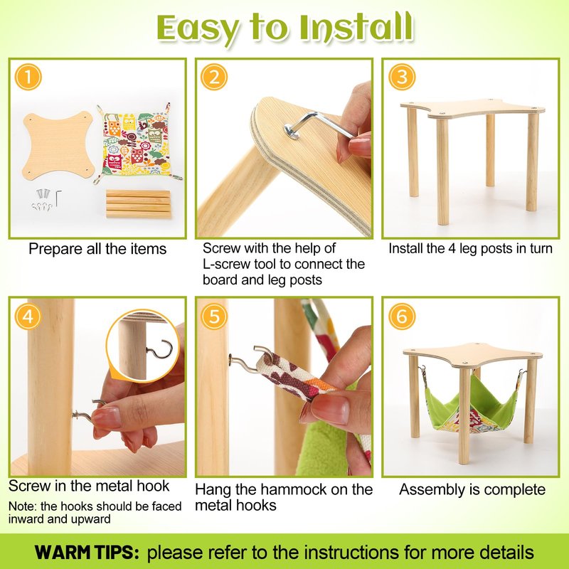 - With Wooden Stand: The small pet cage hammock is supported by a stand, made of natural wood, sturdy and durable, the wooden board on top can provide a safe and hidden space for small pets. You can put it in your pet's cage, or in the corner of your pet's activity place at home.
