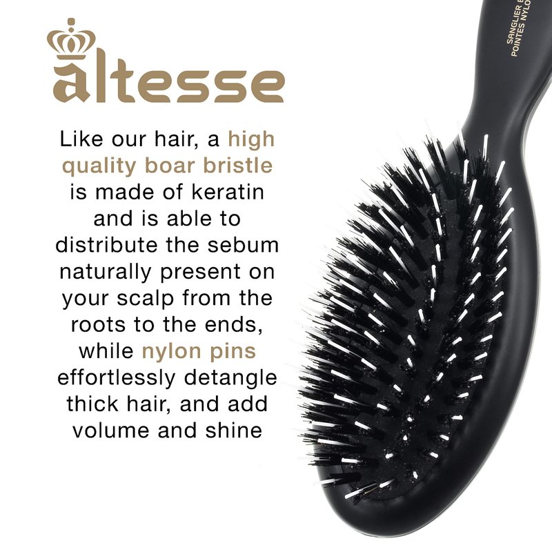 Altesse 8907 Natural Bristle Hair Brush Detangler Brush Medium Air Cushion Matte Black Handle with 7 Rows of Black Boar Bristle and Nylon Hairbrush for Thick Hair Styling and Detangling Made in France