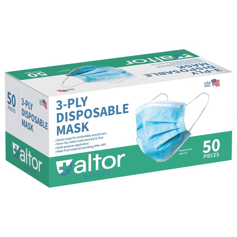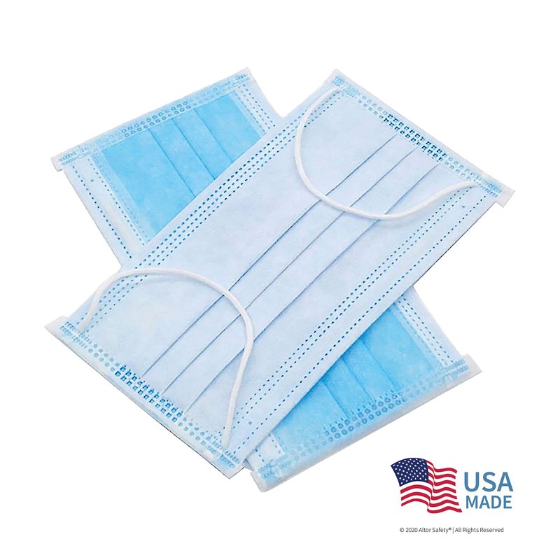 Altor Safety 62212 Blue Disposable Face Masks, USA Made Protective 3 Ply Comfortable Breathable Face Mask with Elastic Earloops and Nose Clip for Adults (Box of 50)