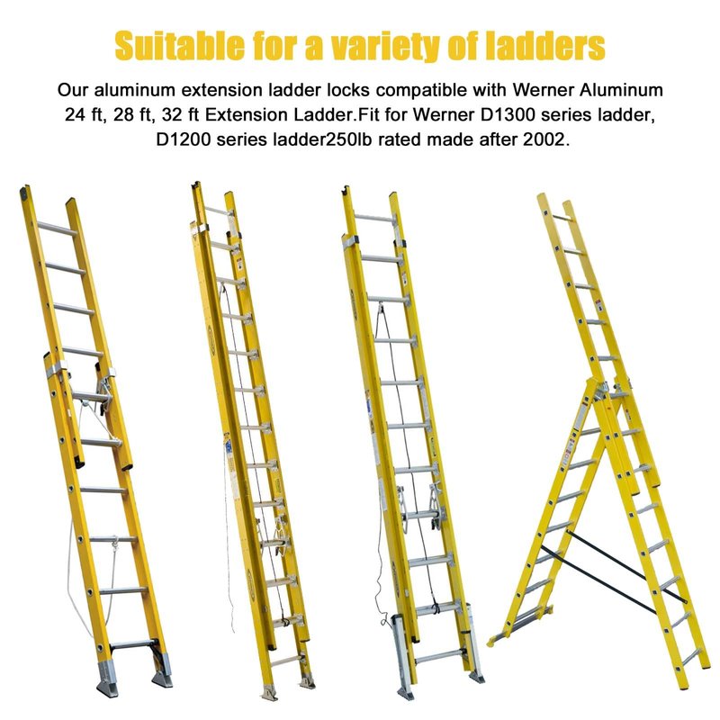 - 【 Compatible Models 】Our aluminum extension ladder locks compatible with Werner aluminum 24 ft, 28 ft, 32 ft extension ladder. The extension ladder part fit for Werner D1300 series ladder, D1200 series ladder, 250lb rated made after 2002.