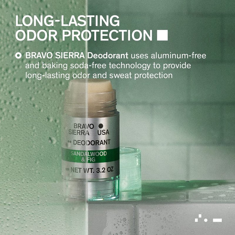 - Long-Lasting Odor Protection: Bravo Sierra Deodorant uses aluminum-free and baking soda-free technology to provide long-lasting odor and sweat protection, even in the most demanding conditions. Sandalwood & Fig has an energizing and vibrant scent with notes of fig, tangerine, amber, and sandalwood.