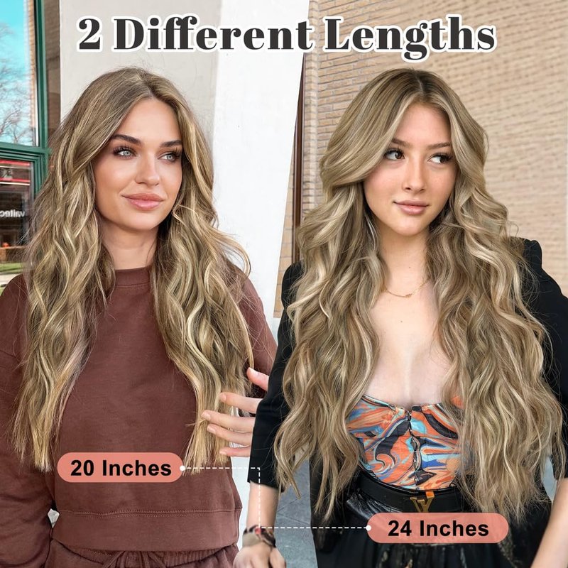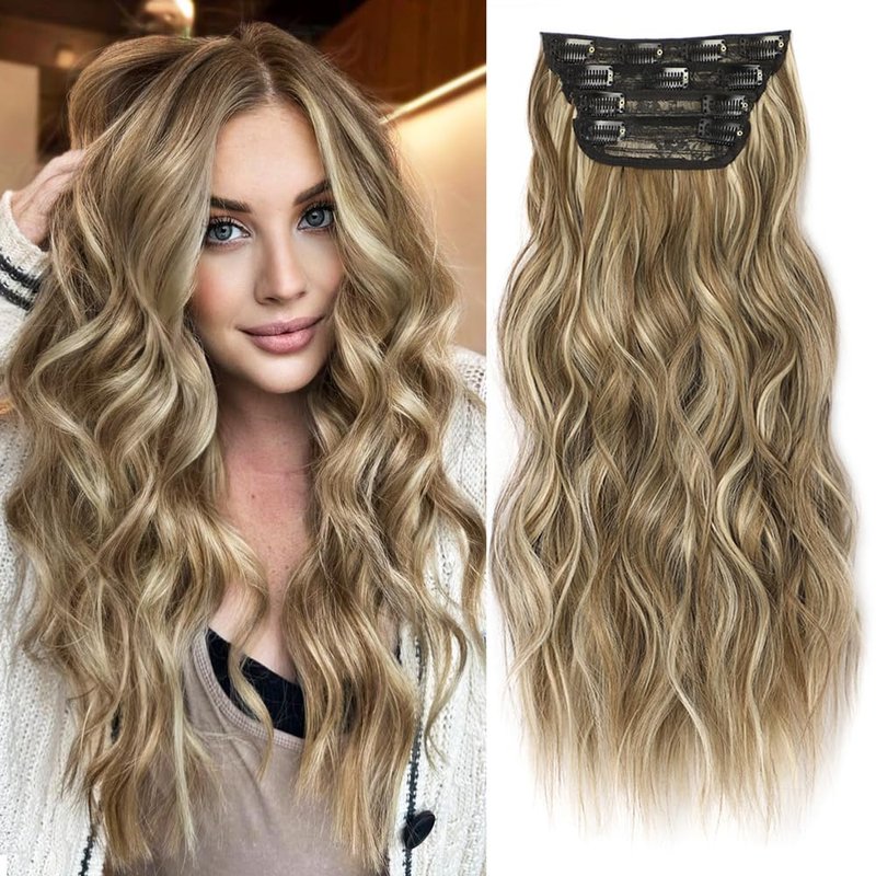 ALXNAN Clip in Hair Extensions for Women,Medium Brown Ash Blonde Long Wavy Hair Extensions Clip Ins 4PCS 20 Inch Synthetic Soft and Natural Thick Hair Pieces for Women