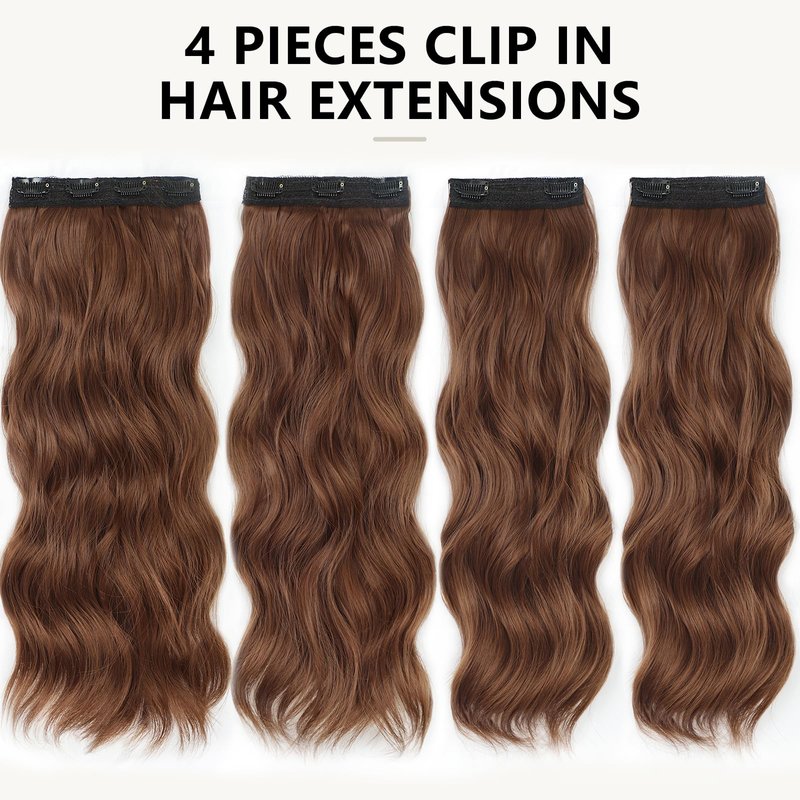 ALXNAN Hair Extensions, 4PCS Clip in Hair Extensions, 20 Inches Medium Brown Long Wavy Natural Soft Synthetic Hairpieces for Women