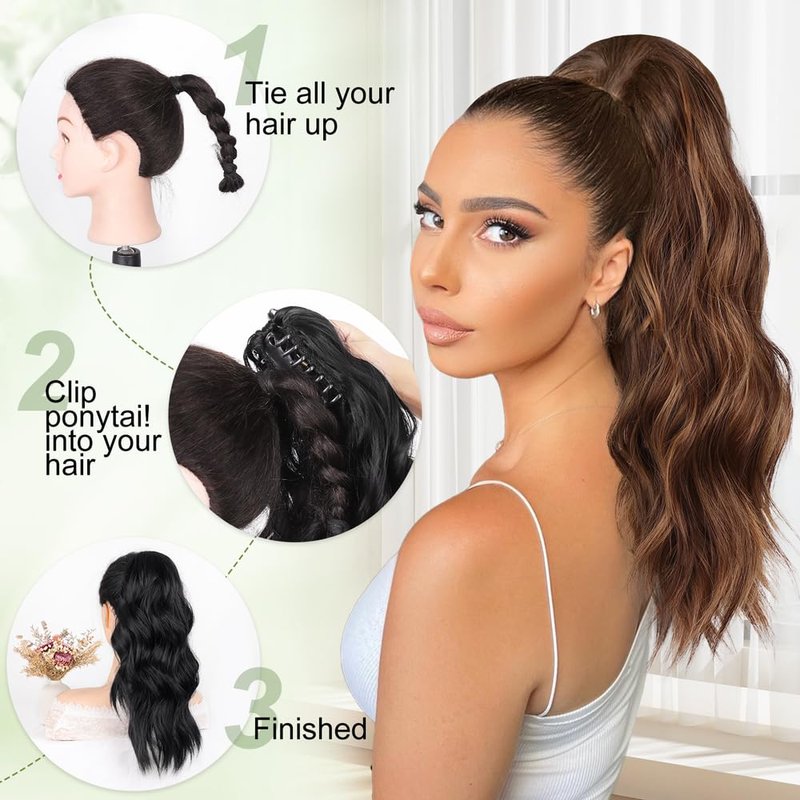 ALXNAN Ponytail Extension,16 Inch Claw Ponytail Hair Extensions for Women,Claw Clip in Long Wavy Synthetic Deep Brown with Dirty Blonde Ponytail Extension for Daily Use.