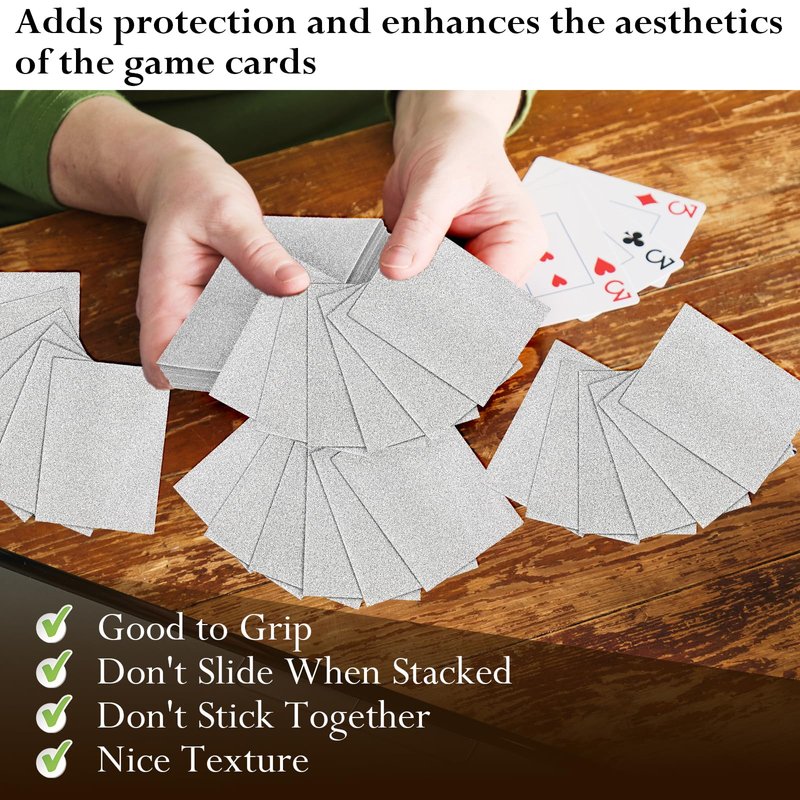 - Silver Matte: Compared with other card sleeves, the sides of our trading card sleeves are designed in bling silver. Our card sleeves are Sturdy, durable, and shuffle smooth, a good value for both sorting and playing. The front has a smooth transparent design, which is more convenient when handling cards and displaying cards. Recommended when you deal or shuffle, the matte side is down and the transparent side is facing up, keep that board game in mint condition.