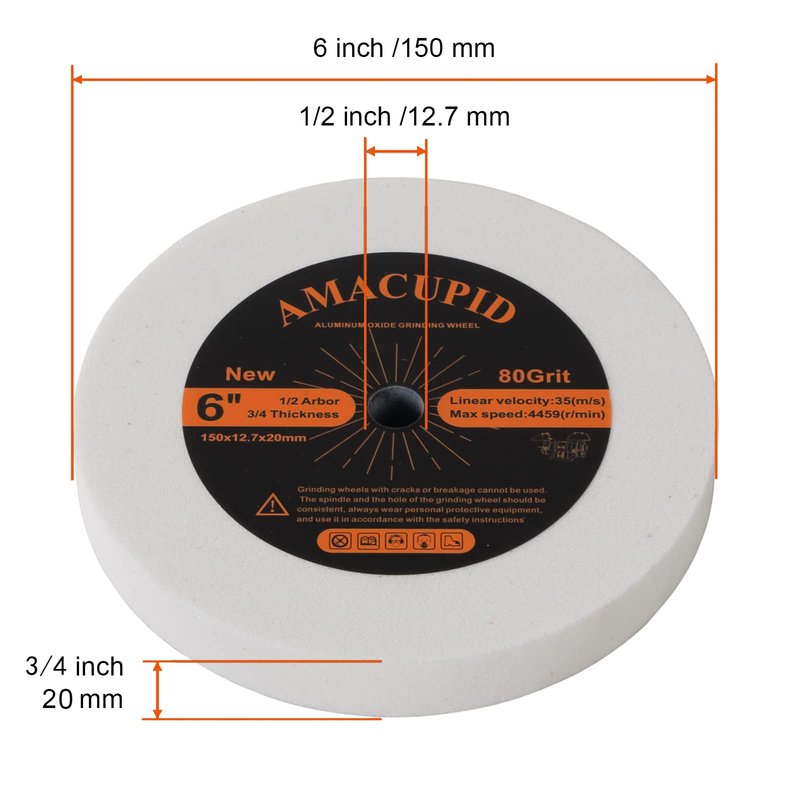 AmaCupid Bench Grinding Wheel 6 inch. for Sharpening Quenched Steel, High Carbon Steel and Other Cutting Tools. White Aluminum Oxide Abrasive. 1/2 inch Arbor, 3/4 inch Thickness, 80 Grit
