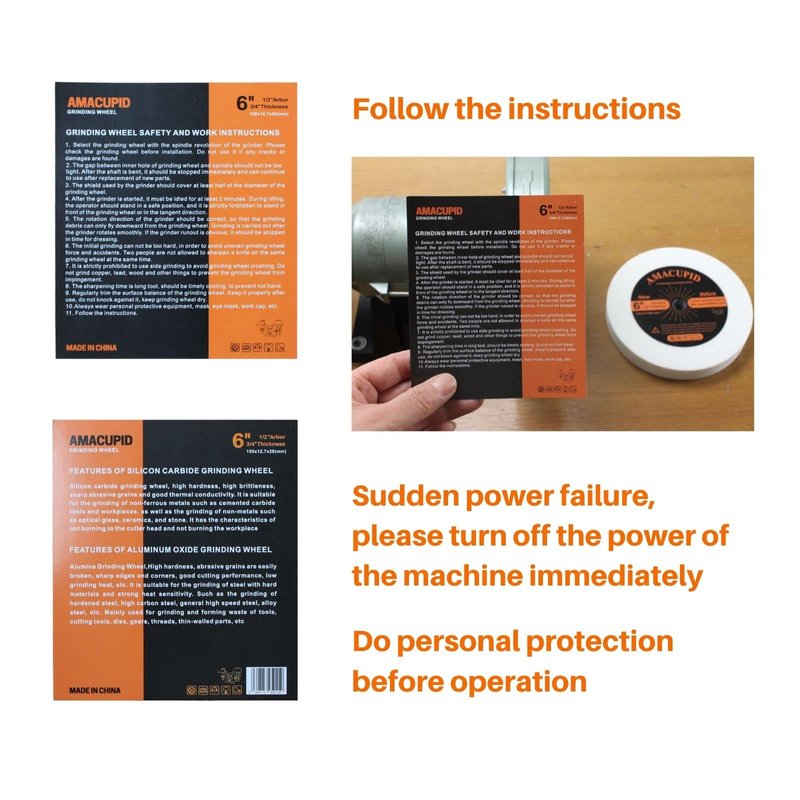Product name: White Alumina Grinding Wheel/White Corundum Grinding Wheel (WA) Product Quantity: 1piece Product weight: 1.6 LBS Safety several work description: 1. Select the grinding wheel with the spindle revolution of the grinder. Please check the grinding wheel before installation.Do not use it if any cracks or damages are found 2.The gap between inner hole of grinding wheel and spindle should not be too tight. After the shaft is bent, it should be stopped immediately and can continue to use after replacement of new parts 3, The shield used by the grinder should cover at least half of the diameter of the grinding wheel 4. After the grinder is started, it must be idled for at least 2 minutes. During idling, the operator should stand in a safe position, and it is strictly forbidden to stand in front of the grinding wheel or in the tangent direction 5. The rotation direction of the grinder should be correct, so that the grinding debris can only fly downward from the grinding wheel. Grinding is carried out after the grinder rotates smoothly. If the grinder runout is obvious, it should be stopped in time for dressing 6,The initial grinding can not be too hard, in order to avoid uneven grinding wheel force and accidents. Two people are not allowed to sharpen a knife on the same grinding wheel at the same time 7. It is strictly prohibited to use side grinding to avoid grinding wheel crushing. Do not grind copper, lead, wood and other things to prevent the grinding wheel from impingement 8, The sharpening time is long tool, should be timely cooling, to prevent hot hand 9. Regularly trim the surface balance of the grinding wheel. Keep it properly after use, do not knock against it, keep grinding wheel dry 10, always wear personal protective equipment, mask, eye mask, work cap, etc