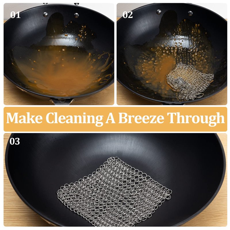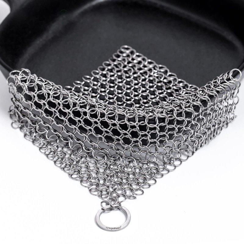 - Unmatched Durability: This cast iron skillet cleaner is machine soldered by Premium 316L Stainless steel, It is ideal for cleaning all your cast iron cookware. Boasting unmatched durability and built to last as long as your cast iron products. Each chainmail ring is designed with the highest quality food grade stainless steel in the industry to be smooth enough for pans, scrub any residue with warm water which will release quickly and easily