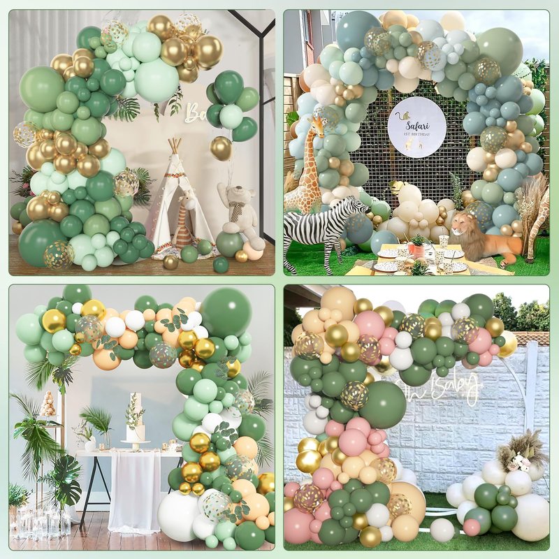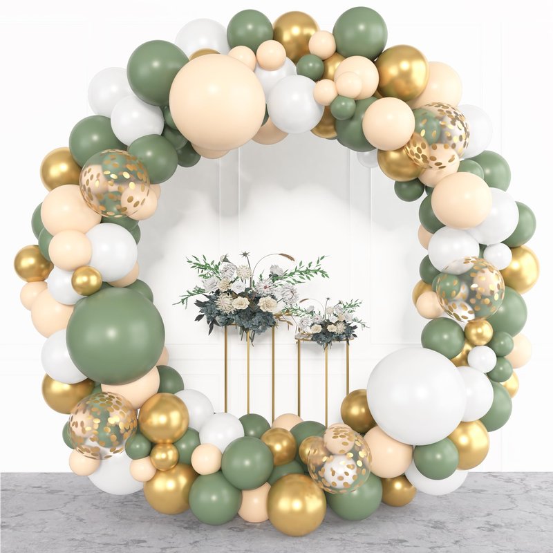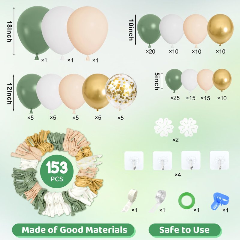- Sufficient Quantity of Green Balloons -The sage green balloon garland includes 18" sage green / blush / pearl white balloons(3pcs), 12" sage green / blush / pearl white /metallic gold/ confetti gold balloons(25pcs), 10" sage green / blush / pearl white /metallic gold balloons(50pcs), 5" sage green / blush / pearl white /metallic gold balloons (65pcs), 10pcs balloon tools (balloon arch strips, tying tool, 100 glue points, ribbon, flower balloon clip, hook).