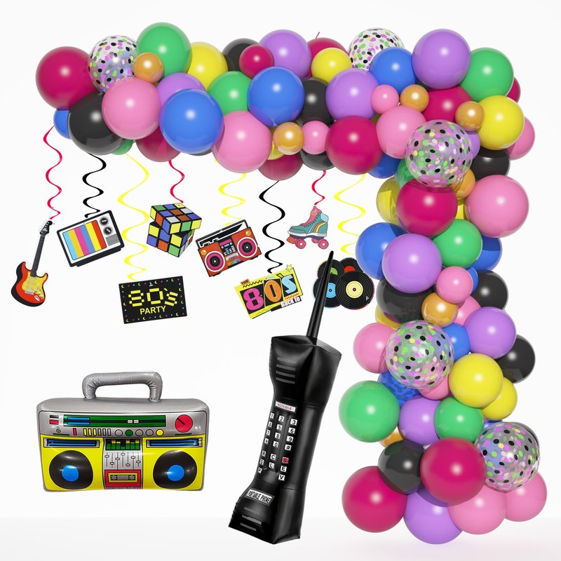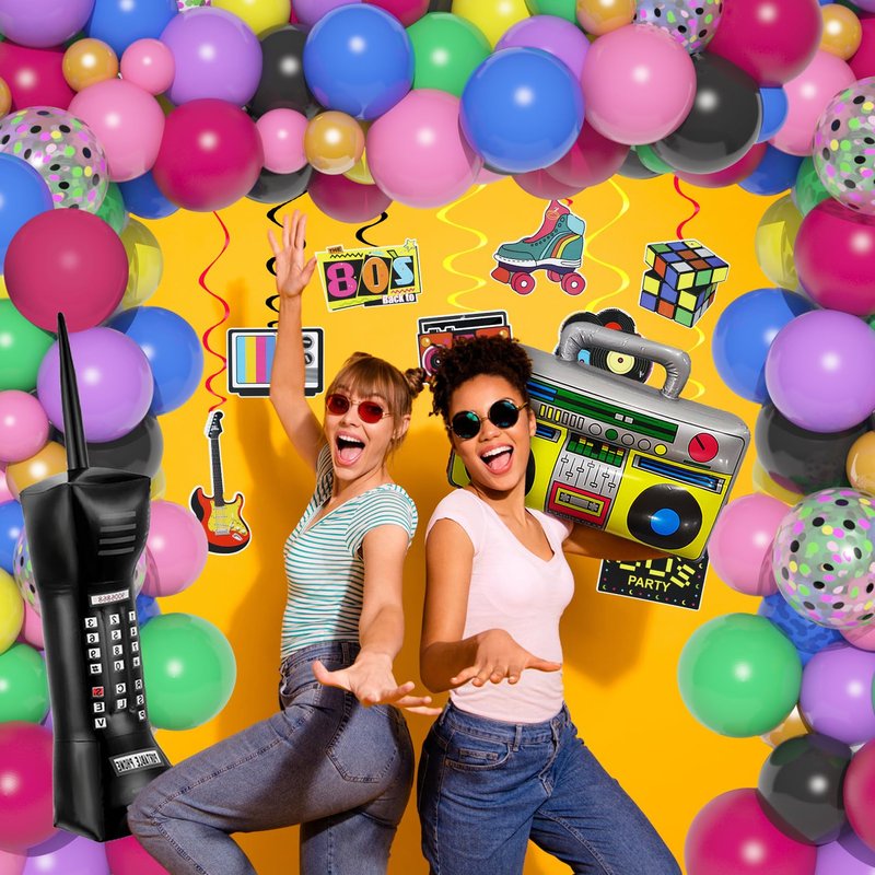 - 80s 90s Party Decorations: This 90s 80s balloons kit include inflatable foil boom box*1, mobile phone*1, 100pcs latex balloons(12"rose red*5, 12"yellow*5, 10"purple*10, 10"yellow*10, 10"green*5, 10"black*10, 10"blue*10, 10"rose gold*10, 10"pink*10,5"pink*10, 5"gold*10), 5pcs 12" confetti balloons, 8pcs 90s party decorations hanging swirls(4pcs black,2pcs red, 1pcs yellow, 1pcs blue), 4pcs tools. Let's go back to the 80s 90s with this 80s 90s balloons garland arch kit.