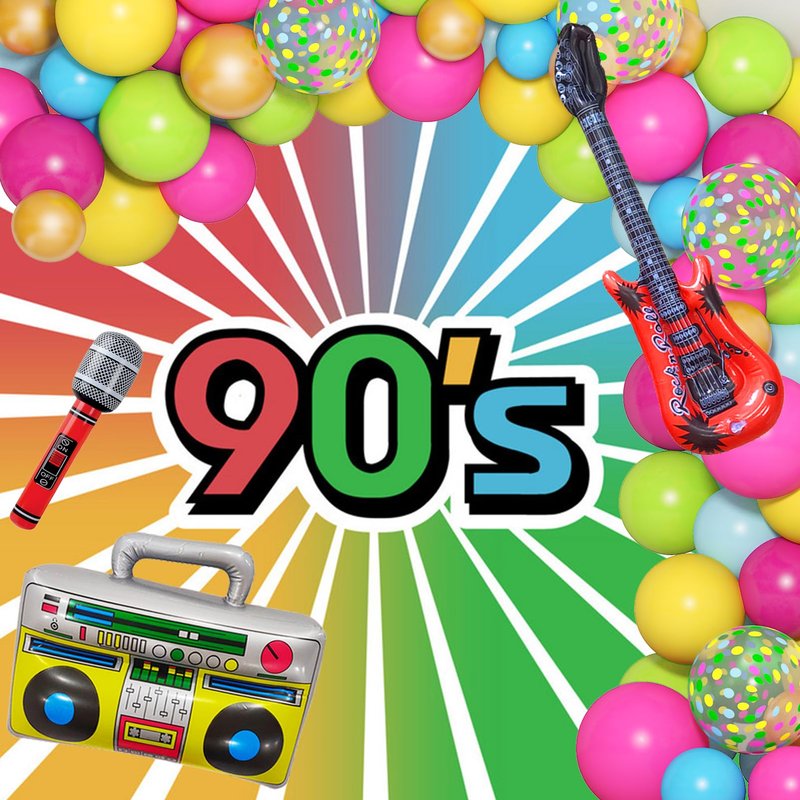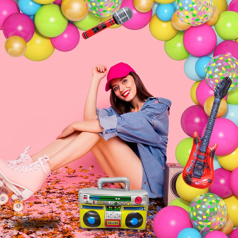 - 90s Party Decorations: The 80s 90s balloons kit include microphone*1, boom box*1, guitar*1, 75pcs latex balloons(12"light rose red/yellow*20, 10"rose red/light blue/fruit green*35, 5"blue/gold*20), 5pcs 12" confetti balloons(rose red+light blue+fruit green+yellow), 1pcs tying tool, 1pcs silver ribbon, 1pcs 100 glue points and 1pcs balloon arch strip. Let's go back to the 90s 80s with this 80s 90s balloons garland arch kit.
