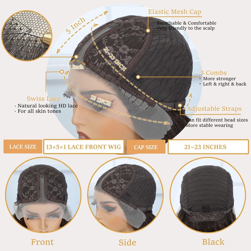 - Lace Front Wig Cap: Average cap size 22.5 inch with 2 adjustable straps and 3 combs. The 3D-cut wig cap. The front is 13 inches of lace, 5x1 inches deep, and the lace portion is a hand-knotted wig that creates a natural hairline.