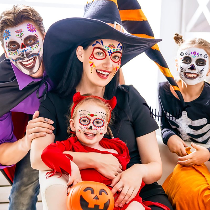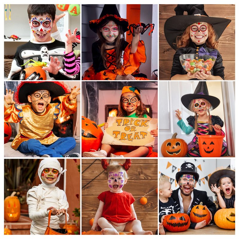 - Halloween Face Tattoos Makeup Kit: Our horror Floral Day of the Dead sugar skull temporary face tattoos use on your face and body, forehead, eyebrows, cheeks, around your eyes, stomach, chest, back, arms or hands. Perfect addition to any Day of the Dead (Dia De Los Muertos) Halloween costume Trick Or Treat! You will get 10 sheets of face temporary tattoos from the package in different patterns such as floral roses, sugar skulls, petal eye circles and more.