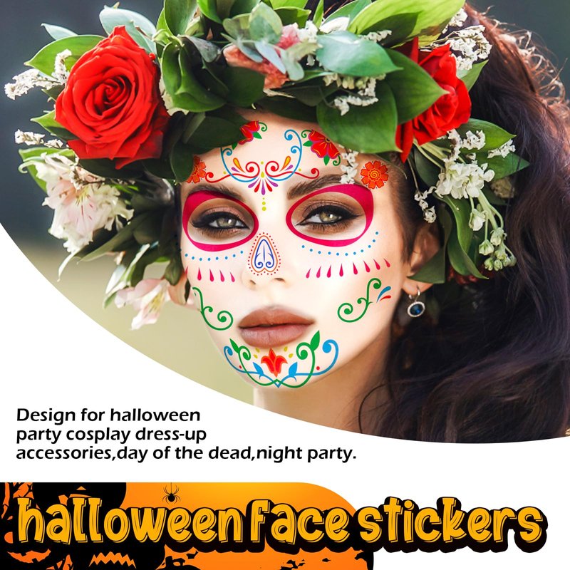 - Personalise DIY Tattoo Sticker: Free to show your personality on Halloween, the Floral Day of Dead sugar skull temporary tattoos can be freely changed according to your creativity. Includes numerous individual tattoo components for precise and creative placement on the face. A wonderful gift and perfect tricking on Halloween.