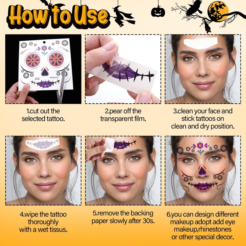 - Easy to Apply & Remove: Our Halloween face tattoos makeup sticker decals are removable and long last. After cutting out the tattoo of choice and removing the clear sheet, place the tattoo face down on the skin, then wet the tattoo thoroughly with a sponge. Just easy to apply in 10-20 seconds with water and easily removed by rubbing, body oil and olive oil but not for sensitive skin.