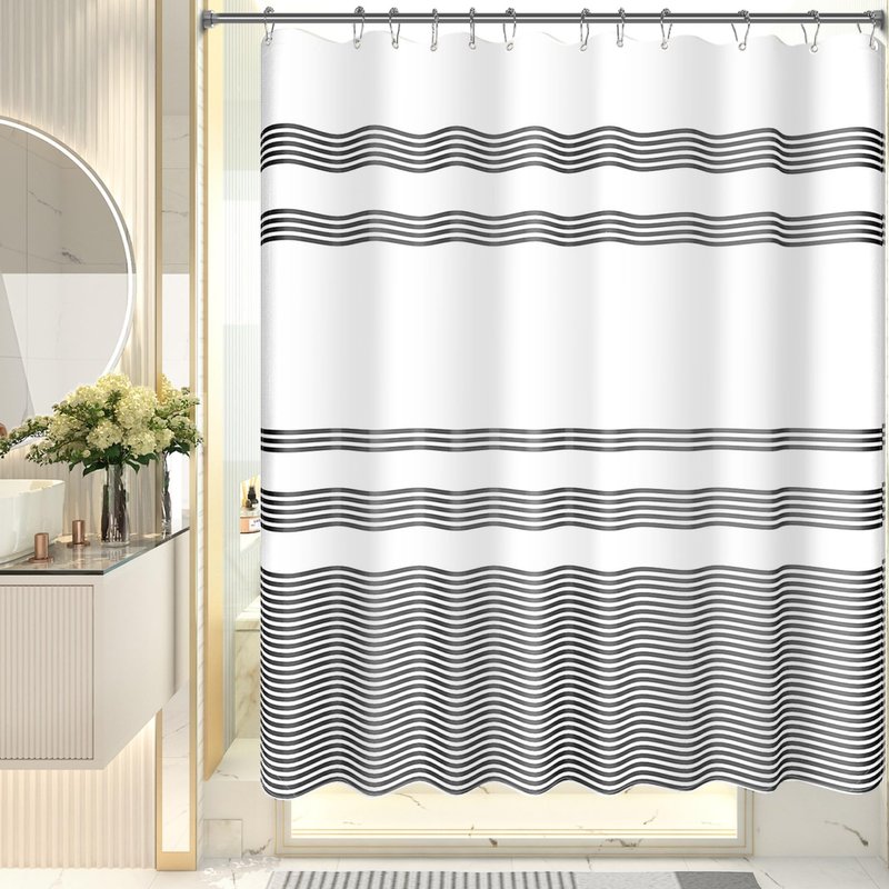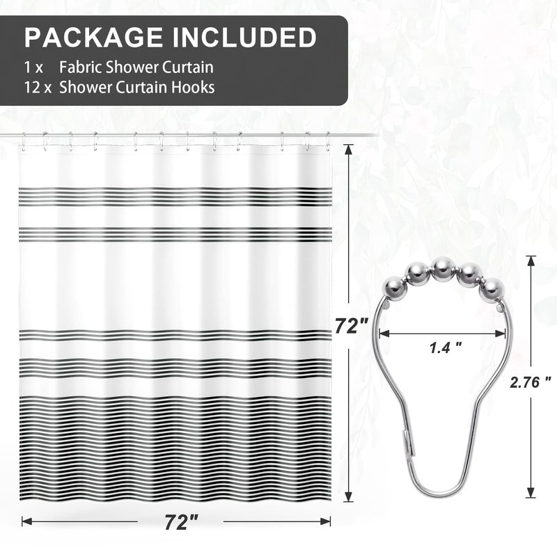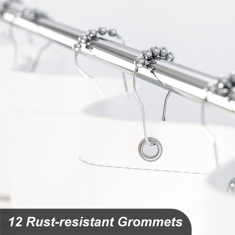 - Luxury Shower Curtain Sets - Our textured polyester shower curtain contains 12 reinforced metal grommet holes, and 12 durable metal nickel brushed shower curtain hooks. The generous 72-inch size is sure to fit most bathtubs and shower stalls and is easy to install.