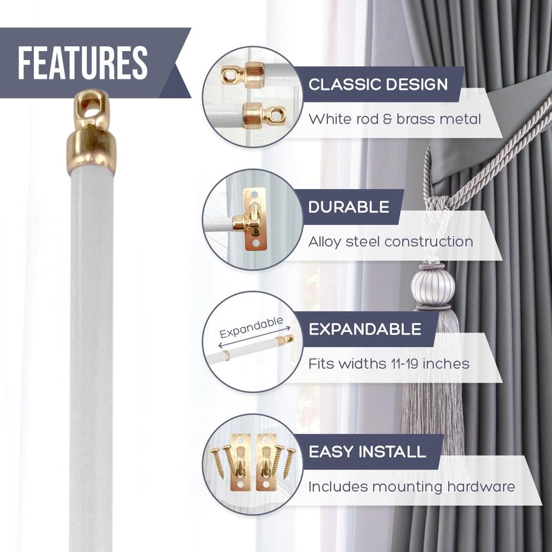 Amazing Drapery Hardware White Swivel Sash Curtain Rods with Brass Ends, Set of 2 (Hardware Included) - Adjustable Length 11-19 Inches, Easy to Install Metal Rods for Doors, Windows, and Sidelights