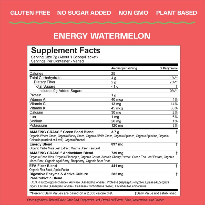 Amazing Grass Greens Blend Energy: Smoothie Mix, Super Greens Powder & Plant Based Caffeine with Matcha Green Tea & Beet Root Powder, Watermelon, 30 Servings (Packaging May Vary)