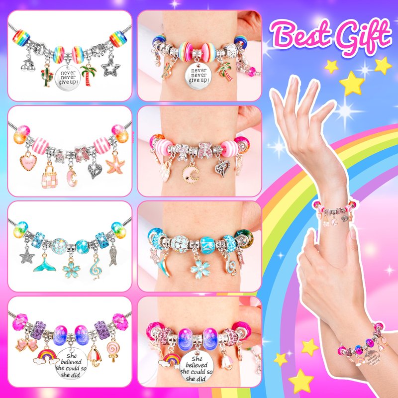 - đăFULL-INSTRUCTIONS INCLUDEDăThis charm bracelets making kit has 4 silver plated bracelet chains and easy-to-follow detailed directions. There are sufficient beads to make 4 full bracelets. Help Girls to creating some unique jewelry pieces that they can then proudly wear different bracelet every day.