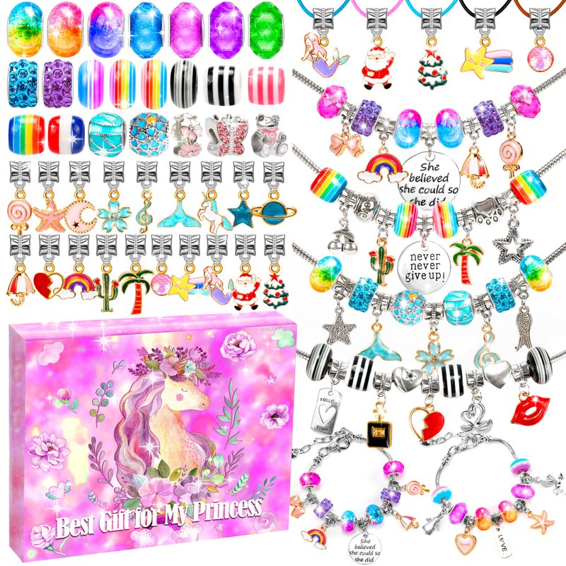 - đăVALUE GIFT BOX KITăYou will get a delicate gift box, with all charms and beads packaged in. The complete charm bracelet making kit includes 4 snake bracelet chains, 39 color charm beads, 40 charm metal beads, 40 charm pendants beads, 5 string necklaces. This must be a great gift item for girls who like DIY accessories.