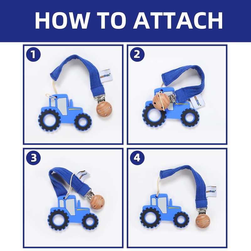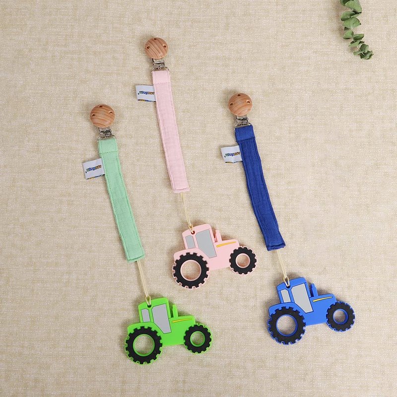 - Convenient: Our tractor teether is perfect size and easy-grasp design for baby to hold,pacifier holder is perfect length for clipping on baby clothes, blankets, toys, strollers, or car seats.