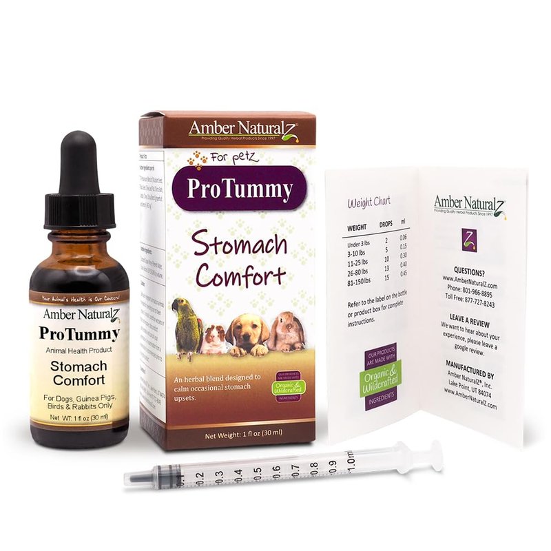 - ProTummy Stomach Comfort: The Amber NaturalZ Pro Tummy supplement for Dogs, Birds, Guinea Pigs, and Rabbits contains a proprietary blend of herbs that help with occasional stomach upsets due to food sensitivities or motion sickness during travel.