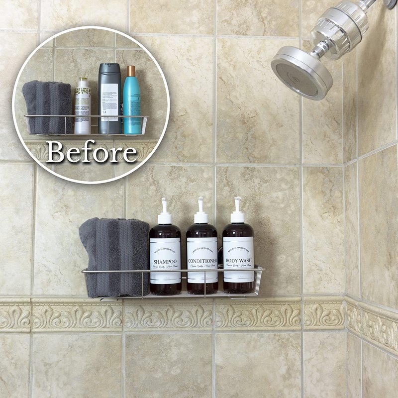 Our shower containers for shampoo, conditioner and soap come with matching waterproof, chrome-accented labels.