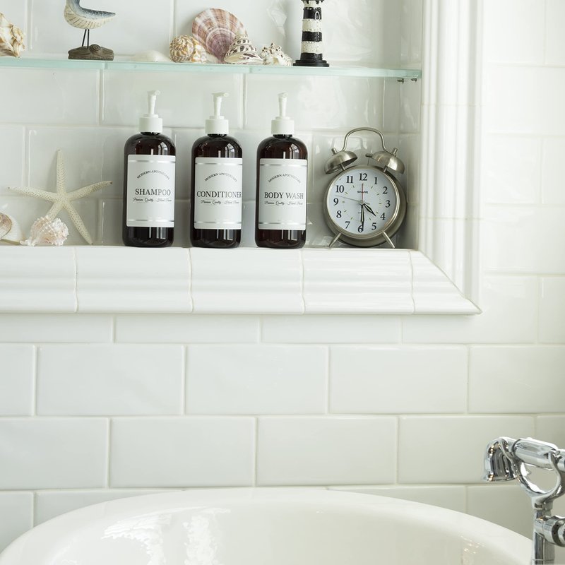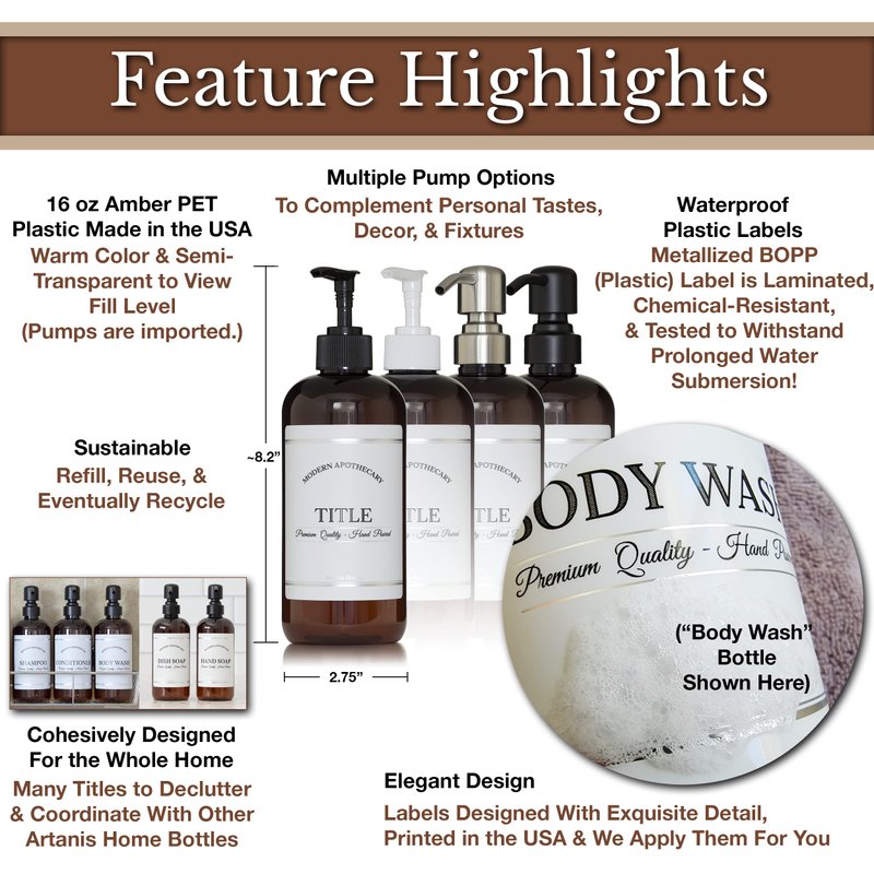 - Bring Style To Your Bathroom: Revel in the luxury of a well-organized shower. Refine your interior decor with these chic body wash, conditioner and shampoo dispenser bottles. Curate your whole home. Modern Apothecary bathroom bottles coordinate with additional matching titles for the sink, kitchen, office, and rentals. Classy, with a touch of retro flair