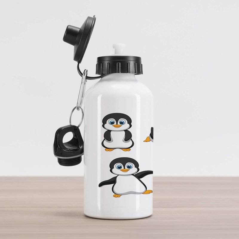 Ambesonne Cartoon Aluminum Water Bottle, Penguin Cartoon Waving Standing Sliding Smiling Animal Humor Antarctica, Insulated Spill-Proof Travel Sports Water Bottle, 16.9 OZ, Orange Black