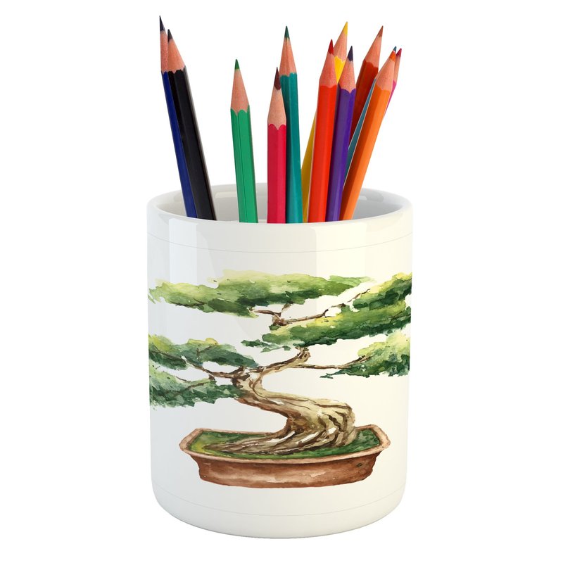 Ambesonne Garden Pencil Pen Holder, Watercolor Style Bonsai Hand Drawn Japanese Tree Eastern Nature Inspired Image, Ceramic Pencil Pen Holder for Desk Office Accessory, 3.6" X 3.2", Green Cocoa