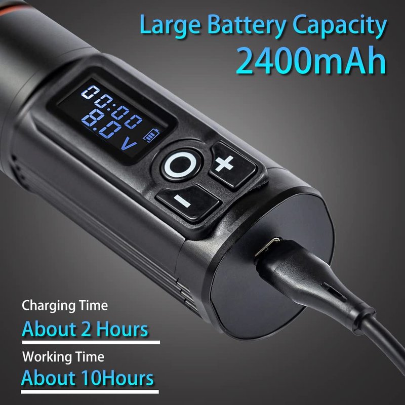 - Big Capacity Battery: This tattoo battery Pen battery capacity is 2400mAh, can support long-term tattoo work, output stable. 8V output voltage can work about 10 hours, only need about 2 hours to fully charge. More importantly, the battery can be replaced at any time.The side of the battery has a visible LCD display, which can clearly show the working voltage, working time and remaining power.