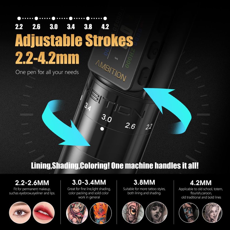 This Ambition Paco V2 tattoo gun support 4.2mm,3.8mm,3.4mm,3.0mm,2.6mm,2.2mm stroke length, change the stroke on the fly just by turning the adjustment knob, ensuring uninterrupted and seamless tattooing working,for a wide variety of tattooing, including lining, color packing, shading, and more.