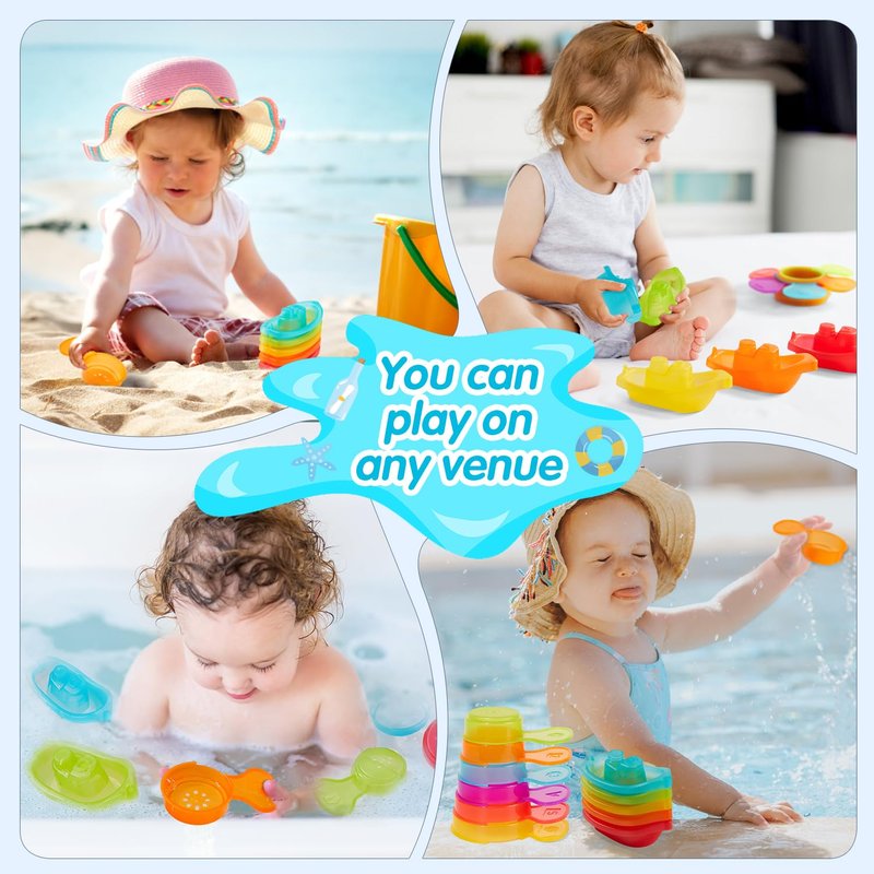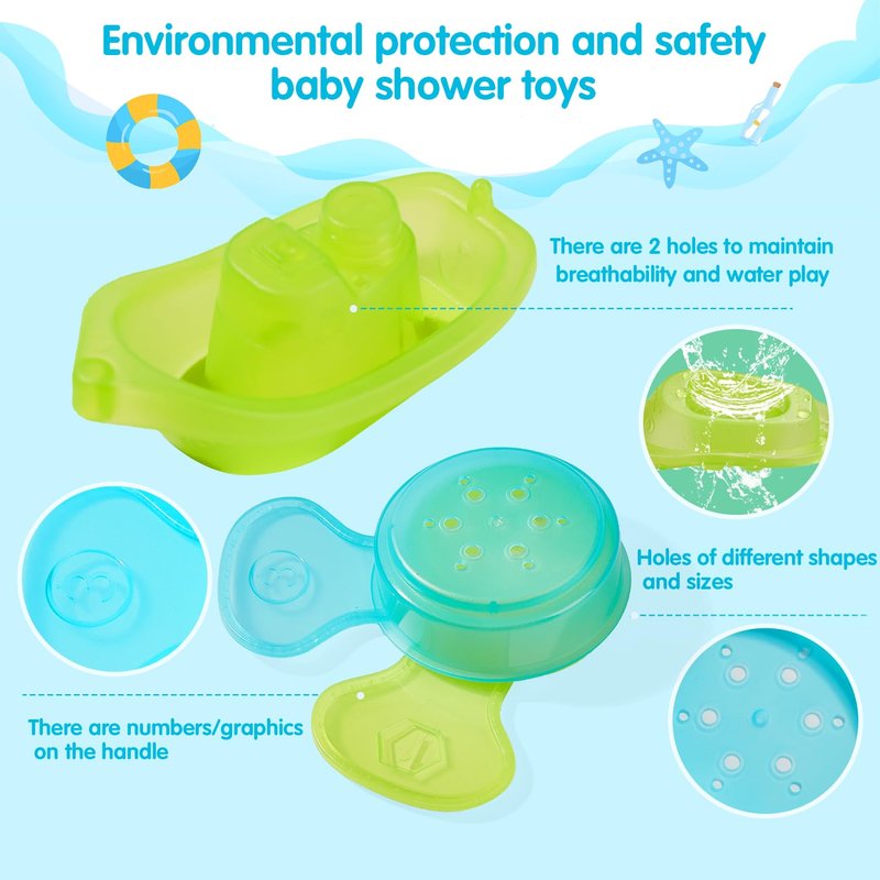 - Versatile Use: Unique holes in the bottom for pouring and water play at bath time. Compact and lightweight, this set is good for use in the bathtub, pool, water table or even at the beach. Our baby bath toy set presents endless play opportunities!