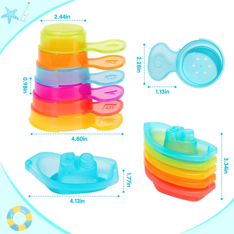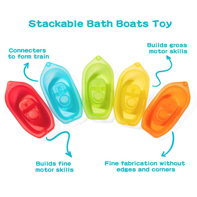 - Endless bath time fun: Bath boats are fun to link, stack, strain and pour water. 5 boats float and link together to create a "rainbow boat train" There are numbers and graphics on 6 spoons of different colors and sizes, making them great for teaching colors, order, number recognition and counting.