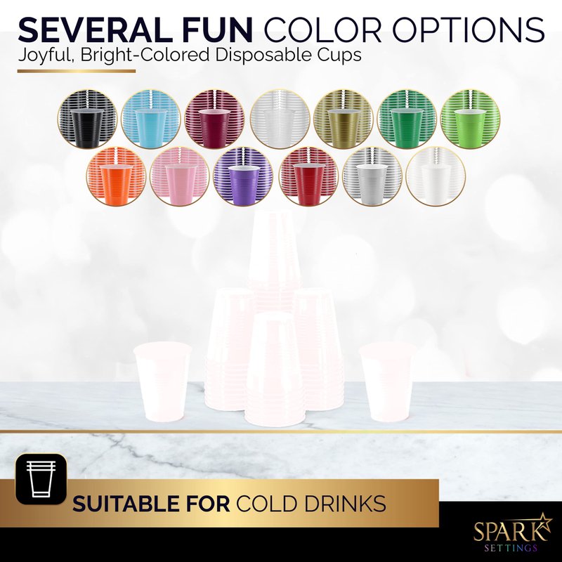 - ✓SPECS - Party cups disposable hold 18 oz of liquid and can be fitted with a Lid. Colorful plastic cups come in 13 vibrant colors Black, Orange, Clear, Lime, Purple, White, Blue, Green, Red, Pink, Gold, Burgundy, and Silver.